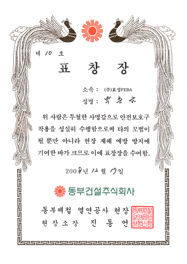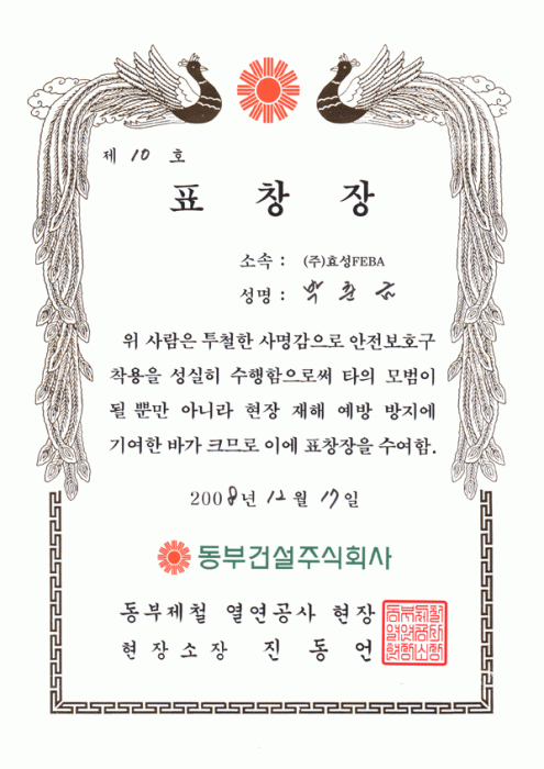 동부제철 연연공사 현장 재해 예방 표창장 수여