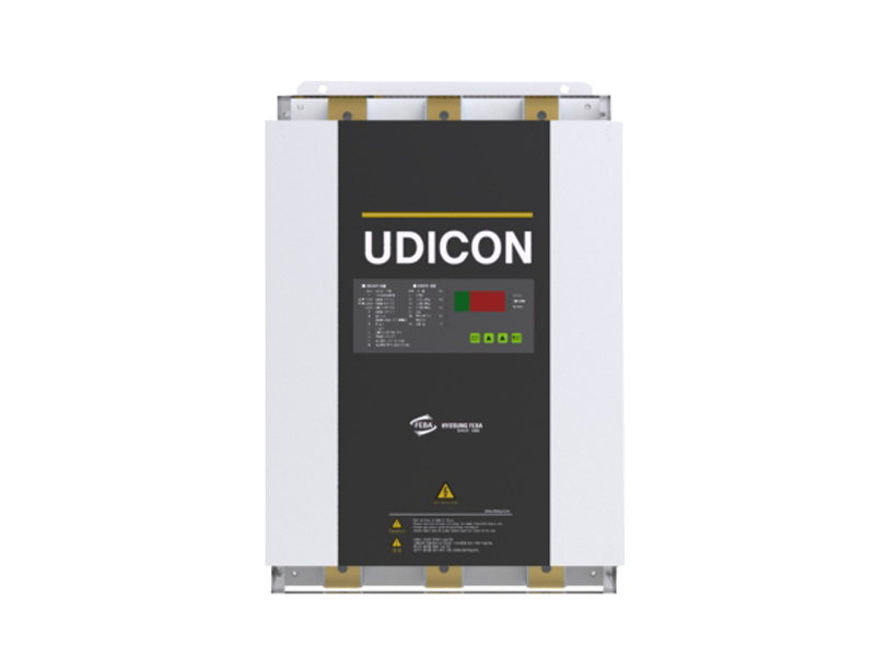 - 유디콘은 유도전동기의 일차 전압을 싸이리스터를사용하여 제어하고, 2차 전압은 2차 저항의 노치를 통하여 동시에 제어하므로 시동이 부드럽고 강한 토크를 발생합니다.